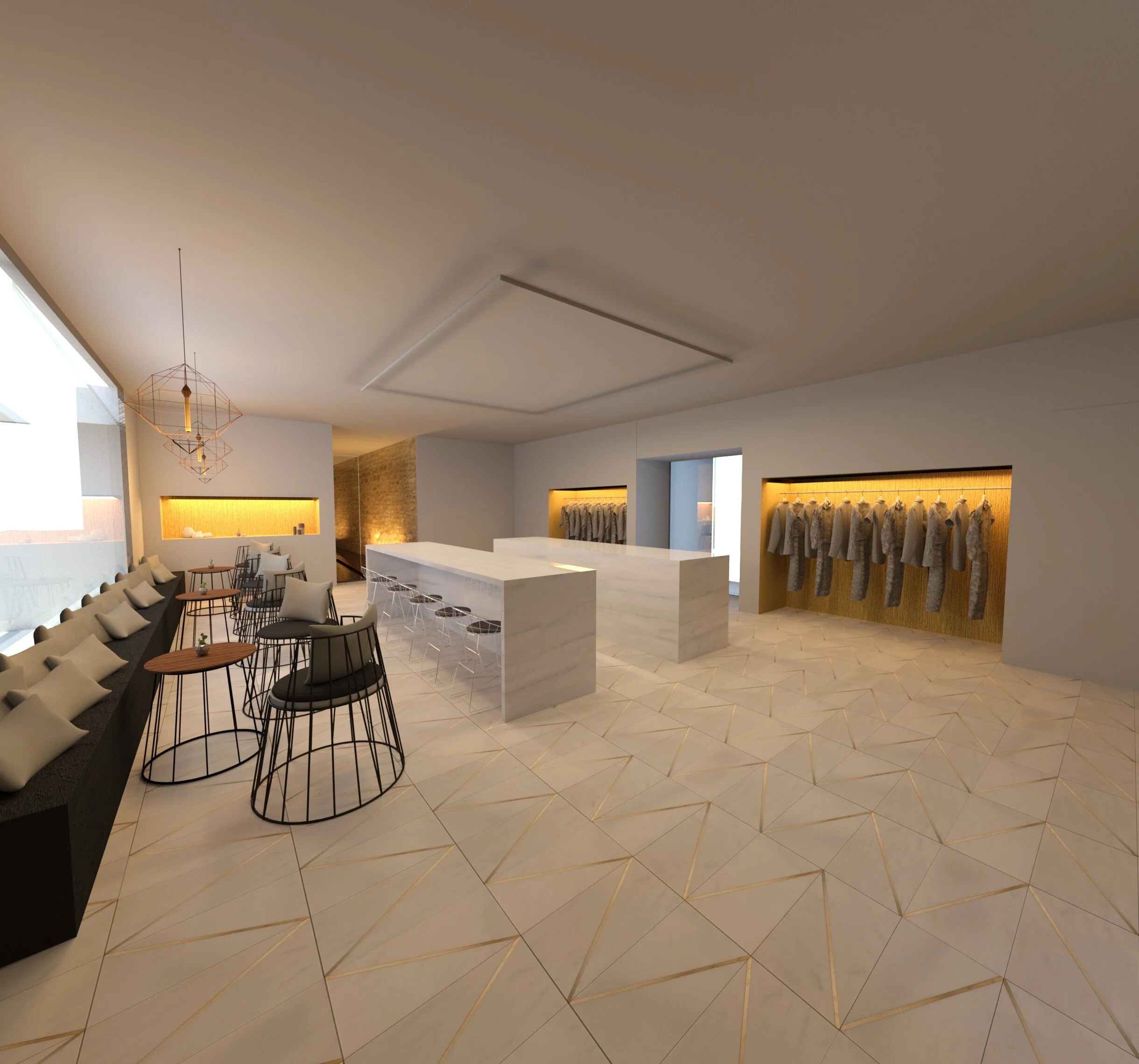 Pour cette nouvelle boutique de prêt-à-porter, j'ai voulu concevoir un espace élégant et visuellement impactant, pensé pour attirer l'œil et favoriser la création de contenu. La sobriété de la décoration, ponctuée de touches de couleur soigneusement choisies, met en valeur chaque pièce de la collection.Le design, inspiré par un jeu de formes entre le carré et le cercle, a permis de créer des niches et des socles aux lignes épurées, parfaits pour exposer les articles et susciter l'intérêt visuel. Cette architecture réfléchie permet également au personnel de produire facilement du contenu en intégrant les éléments du décor, rendant chaque coin de la boutique "instagrammable" et propice à l'inspiration et à la créativité.